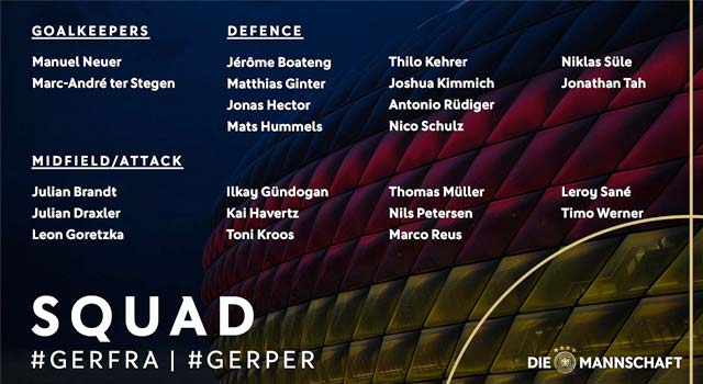 โยอาคิม เลิฟ ผู้จัดการทีมคนเก่งของทีมชาติเยอรมนี ได้ออกมาประกาศรายชื่อนักเตะทั้ง 23 นักเตะ ที่จะใช้ในศึกเนชั่นส์ ลีก กับ ทีมชาติฝรั่งเศสและกระชับมิตรกับทีมชาติเปรู