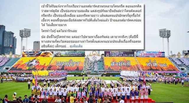 ปล อันนี้ไม่รู้ใครทำนะ แต่อย่าไปตามหาเรื่องกันต่อ เดายากจริงๆ (คือปีนี้ทางสนามก็คงไม่ค่อยชอบเราเท่าไหร่ตั้งแต่เพจแขวะประเด็นเรื่องที่จอดรถอธิบดีล่ะ) เด็กๆอย่าไปเอาคืน พวกเรามีความศิวิไลซ์ อย่าไปทำอะไรไม่เข้าท่าตามเค้า จริงๆถือว่าเป็นความบกพร่องของสนามด้วยนะ ที่ปล่อยให้ทรัพย์สินของแต่ละโรงเรียนเสียหายแบบนี้