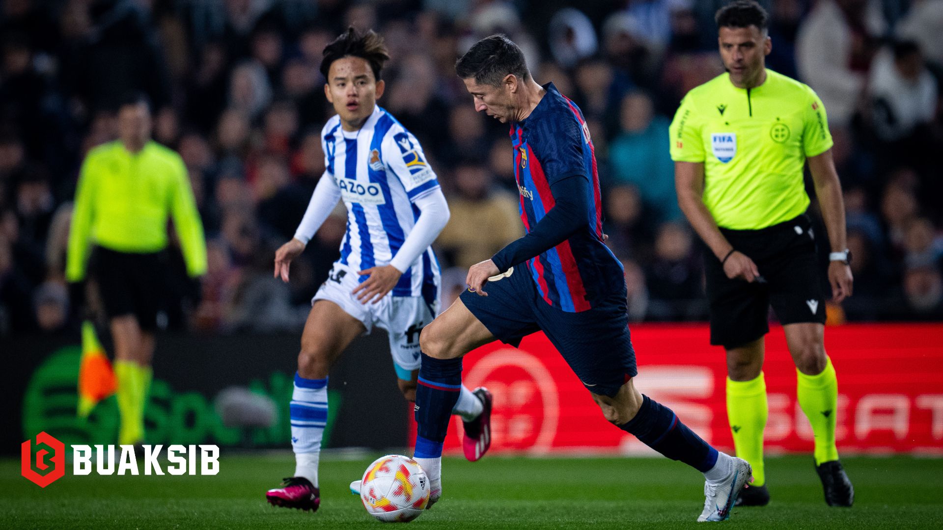 ในช่วงครึ่งแรก เรอัล โซเซียดัด เหลือผู้เล่น 10 คน เนื่องจาก บราอิส เมนเดส โดนใบแดงไล่ออกจากสนามในนาทีที่ 40 เข้าสู่ครึ่งหลัง “เจ้าบุญทุ่ม” ขึ้นนำไปก่อนจาก อุสมาน เดมเบเล่ ในนาทีที่ 52