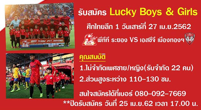 สโมสร “พลังเพลิง” พีทีที ระยอง เปิดรับสมัครเด็กจูงมือนักเตะลงสนาม “Lucky Boys & Girls” จำนวน 22 คน เพื่อเดินจูงมือนักเตะลงสนามในเกมไทยลีก 1 สัปดาห์ที่ 9 ซึ่งทีม “พลังเพลิง” จะเปิดบ้านพบ “กิเลนผยอง” เอสซีจี เมืองทอง ยูไนเต็ด ในวันเสาร์ที่ 27 เม.ย.2562 เวลา 17.45 น. ณ PTT STADIUMS