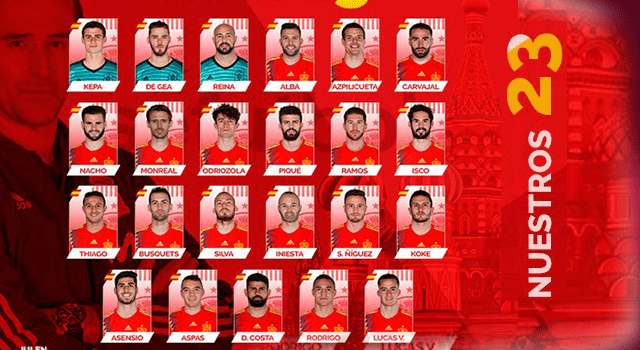 ฆูเลน โลเปเตกี นายใหญ่ทีมชาติสเปน เลือกผู้เล่น 23 คนที่จะพาลุยรัสเซียนำโดยกัปตันทีมอย่าง เซร์กิโอ รามอส และ ตัวมากประสบการณ์อย่าง อันเดรส อิเนียสต้า