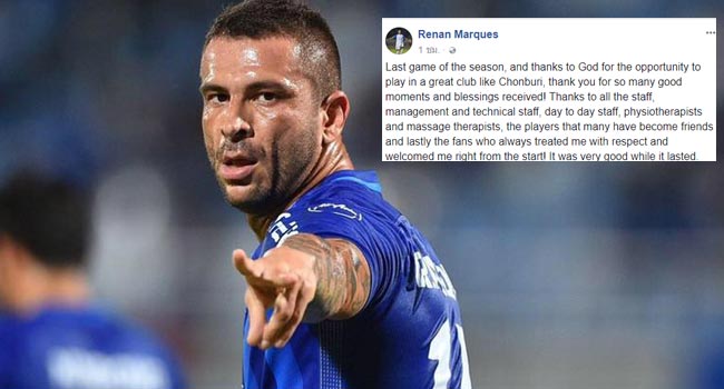 ก่อนหน้านี้ ติอาโก้ คุนญา กองหน้าชาวบราซิล เพิ่งได้โพสต์สั่งลาแฟนบอลไป ล่าสุด เรนัน มาร์เกวซ กองหน้าจอมถล่มประตูของทีมได้ออกมาโพสต์ขอบคุณทีมงาน ซึ่งหลายฝ่ายคาดการณ์ว่า เรนัน มาร์เกวซ อาจโบกมือลา ชลบุรี เอฟซี หลังจบการแข่งขันฤดูกาลนี้